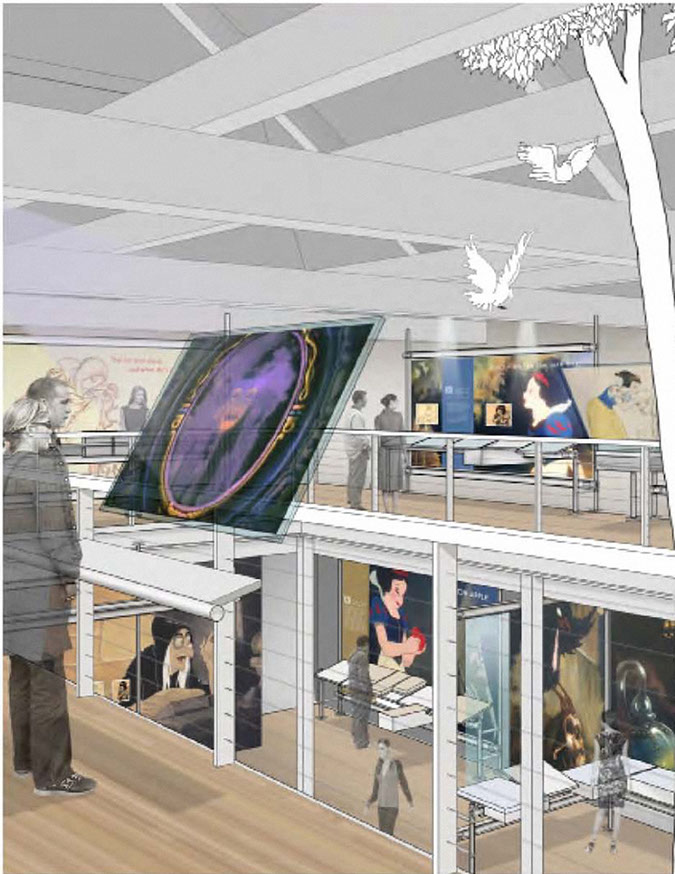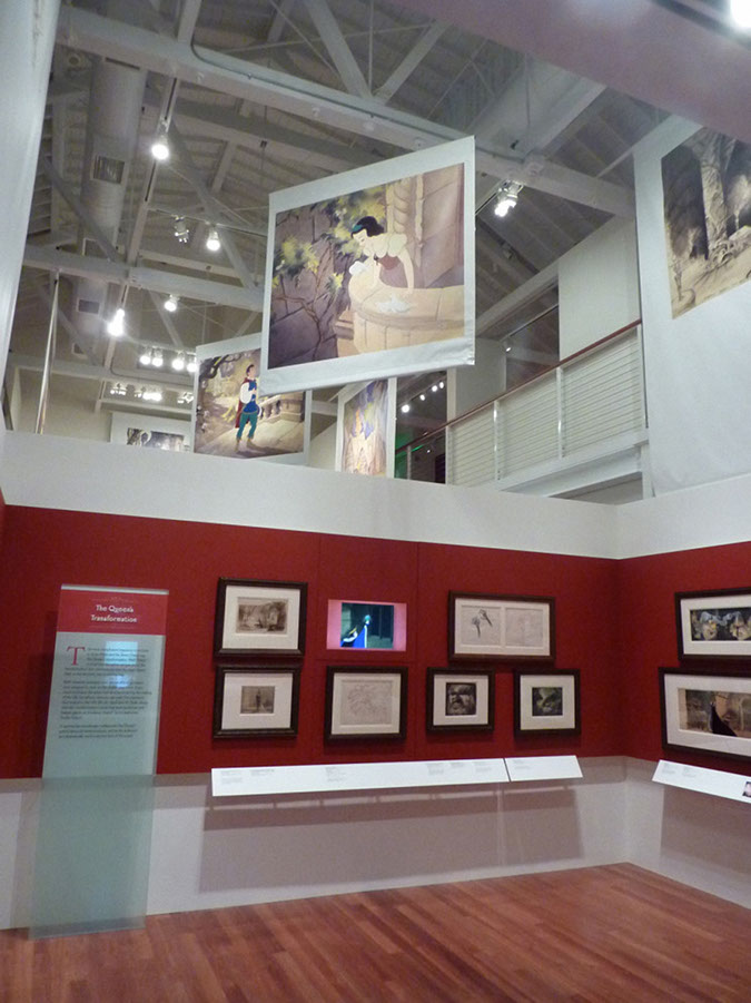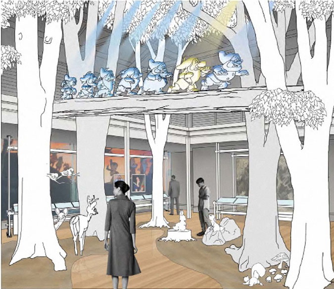 Engaged meetings on budgets and discussing constraints shifted the design program from an interactive immersive experience that included set scenes from Snow White to an installation focused on ideas, drawings and creative process in the making of the film. Images here depict the design process and final exhibit.